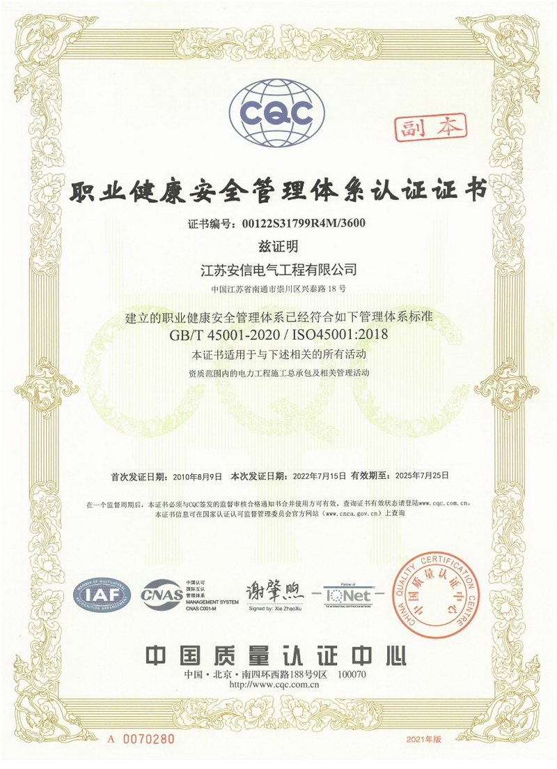 在創(chuàng)業(yè)之初,公司就堅持高起點的戰(zhàn)略思路,廣納賢才,集聚行業(yè)精英,創(chuàng)新發(fā)展,做優(yōu)企業(yè)品牌。現已取得:承裝二級、承修二級、承試二級,電力工程施工總承包二級,輸變電工程專業(yè)承包二級,建筑工程施工總承包二級,建筑機電安裝專業(yè)承包二級,地基基礎專業(yè)承包二級資質證書,并通過了質量、環(huán)境、職業(yè)健康和安全管理體系認證,確保各項工作有序管控。